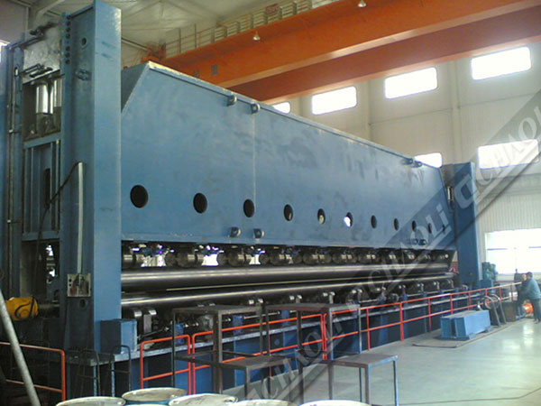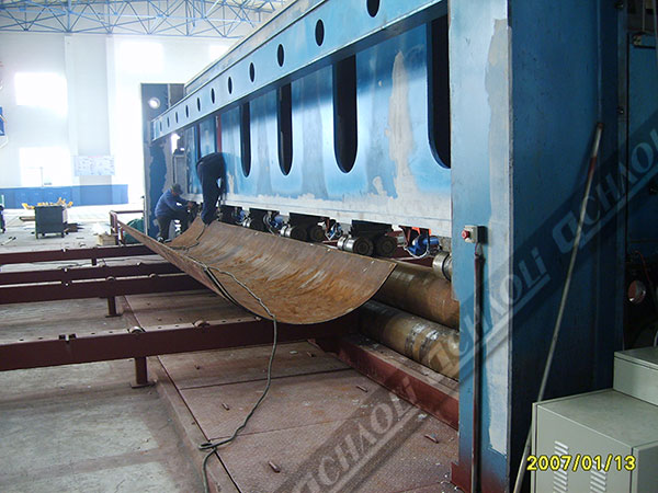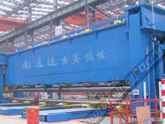 船用三輥對稱式卷板機結構型式為三輥對稱式,上輥在兩下輥中央對稱位置作垂直升降運動,通過液壓缸內的液壓油作用于活塞桿而獲得,為液壓傳動;通過特殊設計減速機分別帶動全滾動軸承的兩下輥作旋轉運動,為卷制板材提供扭矩;在下輥下部設有多組托輥,以提高下輥的剛度,并可進行垂直調節;在上輥的上部設有剛性大梁,在大梁與上輥之間設有多組托輥,以提高上輥的剛度;適用于超寬圓弧形零件的卷制??删戆搴?mm-50mm,板寬21000mm的板料。