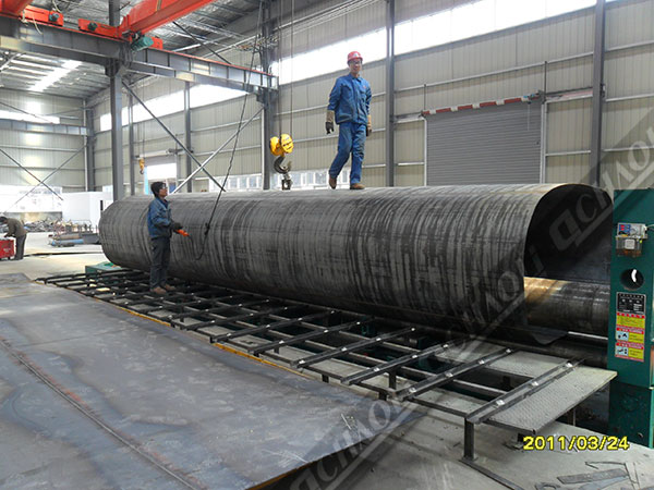 掛車用卷板機增加托輥及上輥撓曲補償可使筒件取得較好的直線度??稍黾油馔辛霞芗皟壬霞苁共僮鞲憷?,更少人工??膳浜锨昂蟮拦ば蜃魃a線優化使用。